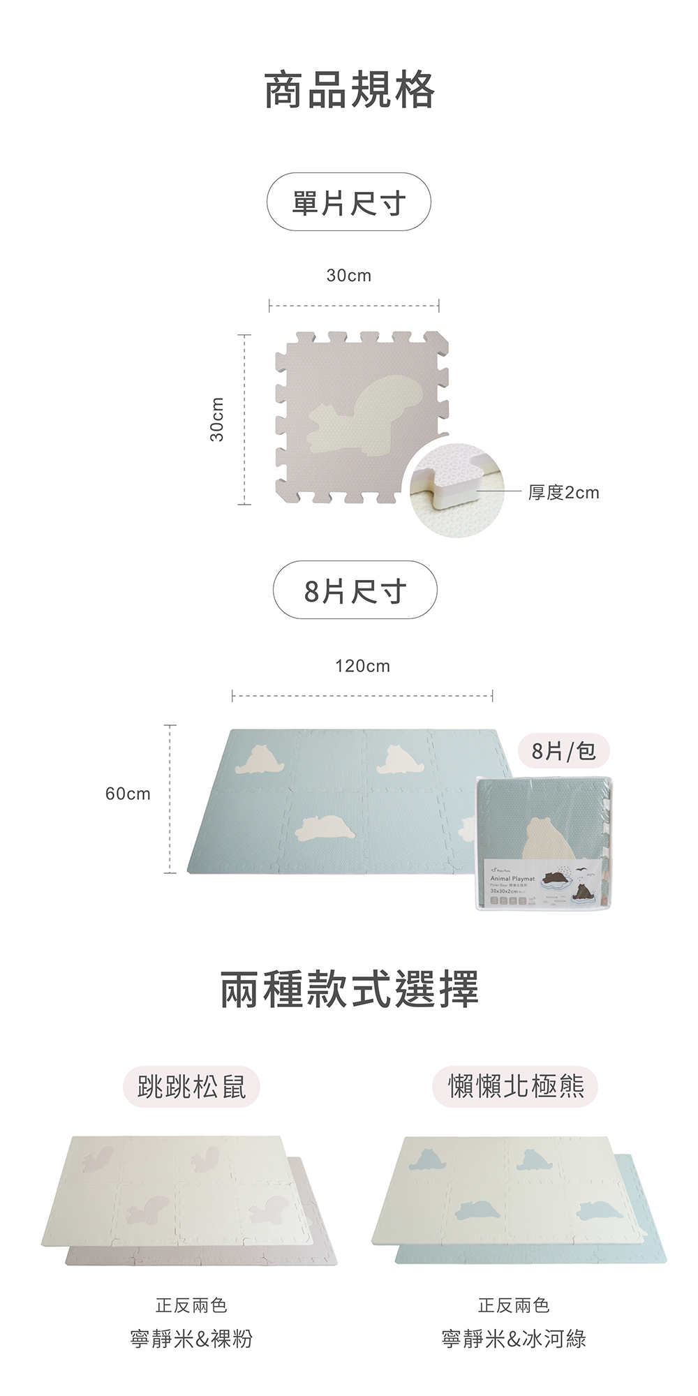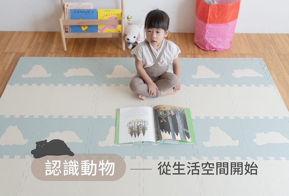 透過創意將北極熊與松鼠放進地墊,選用兩種柔嫩色系更貼近北極熊與松鼠的概念,讓討喜的動物陪著孩子一起成長。