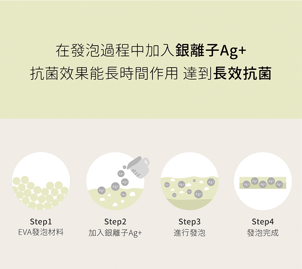 1. 添加銀離子Ag+共同發泡而成,可維持長效抗菌。