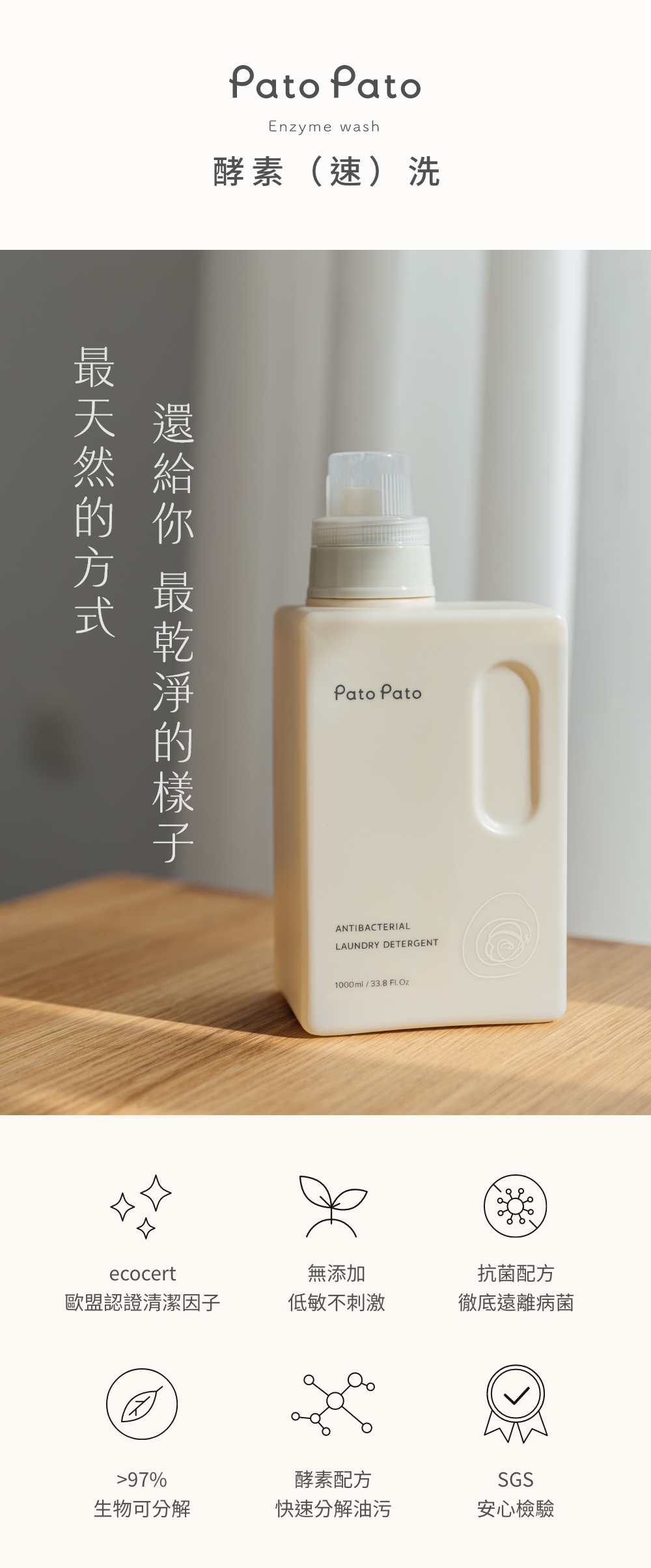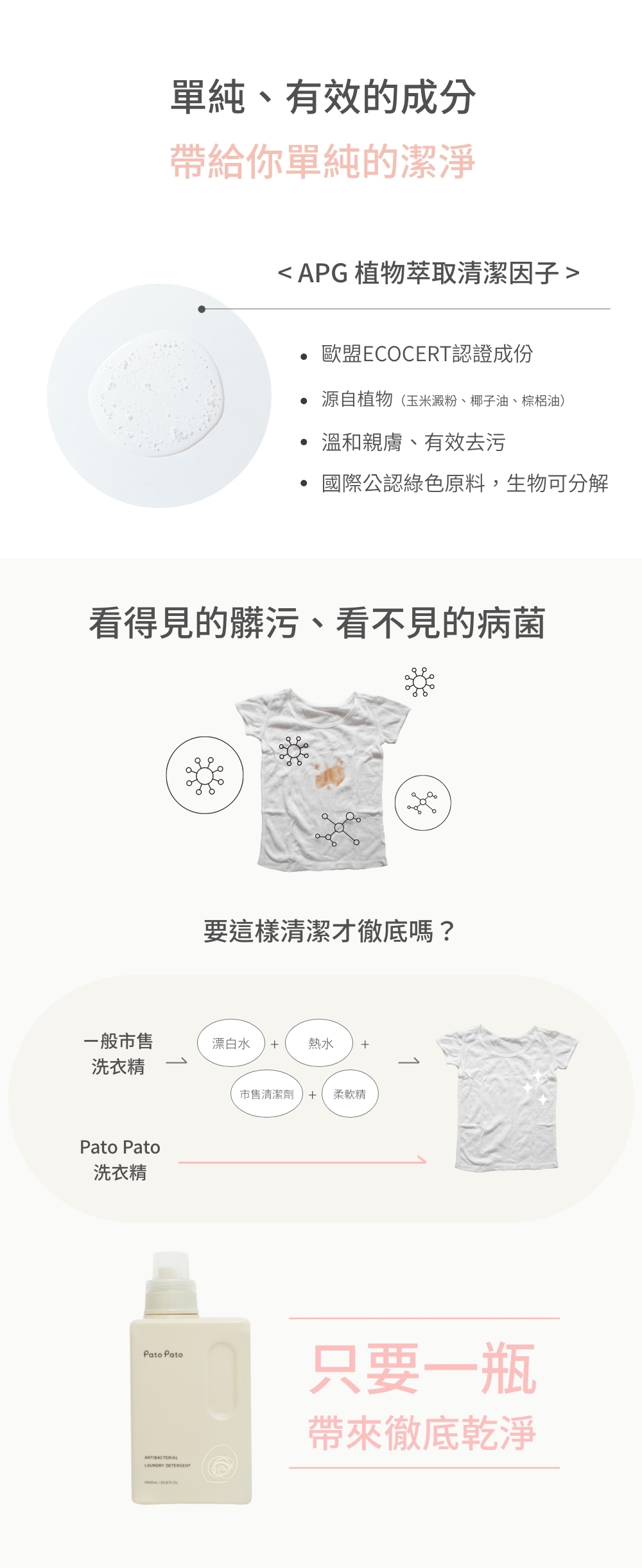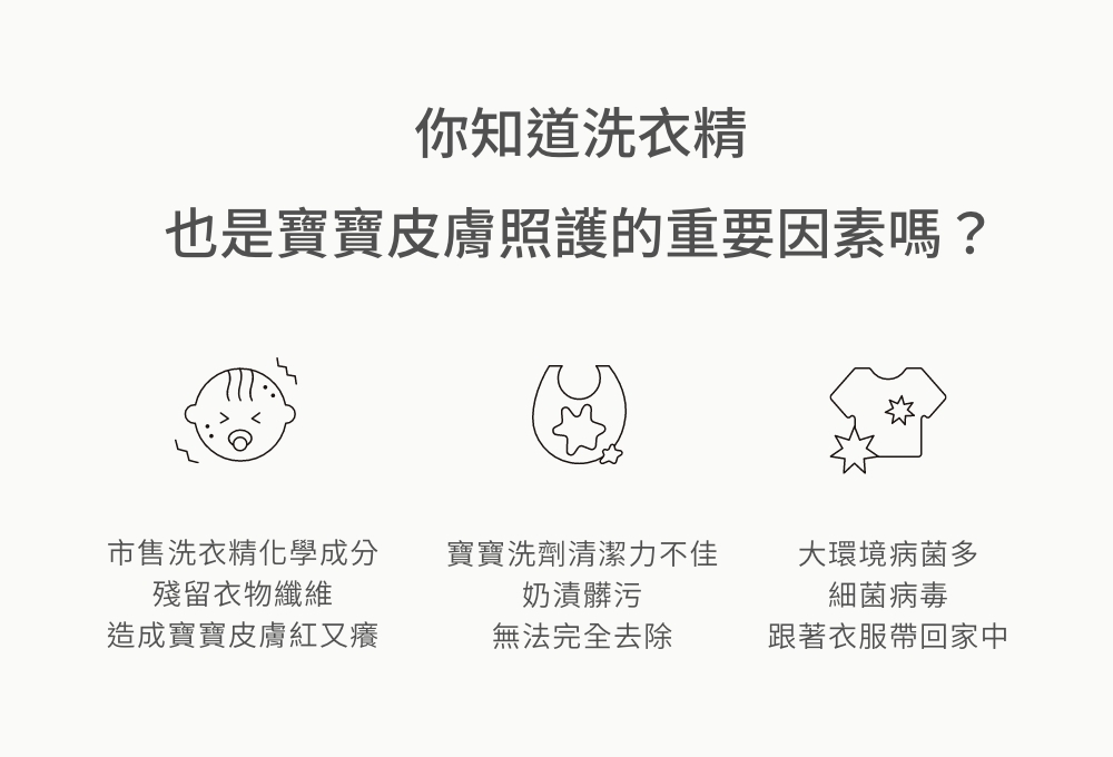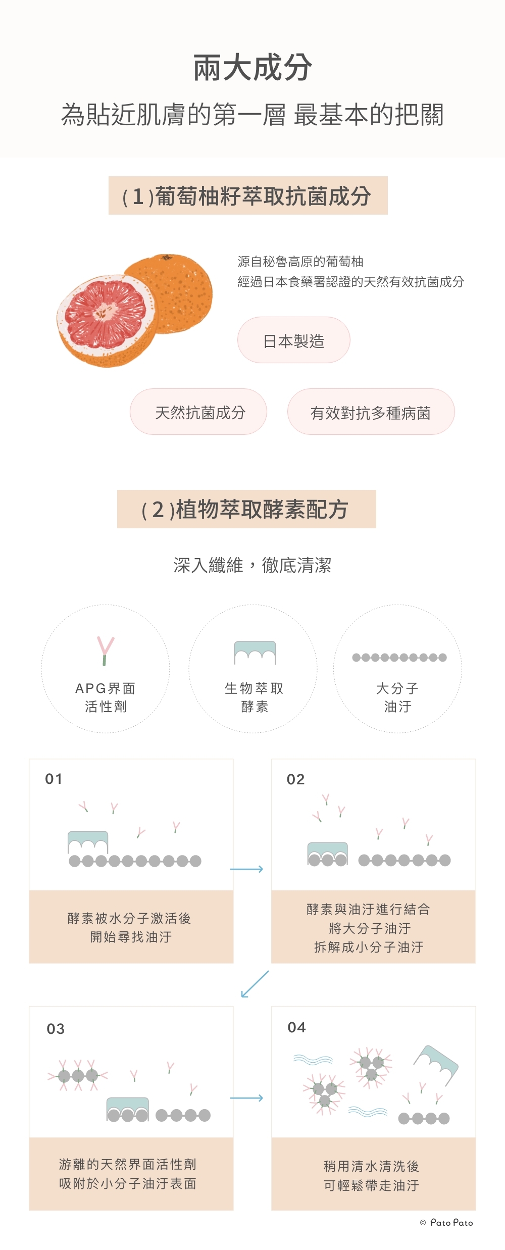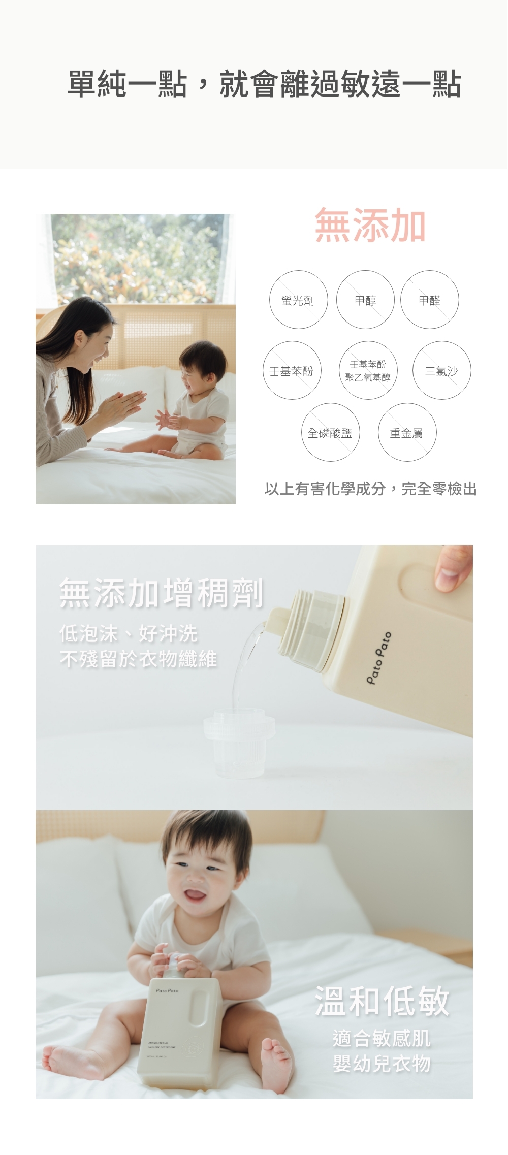 -專為嬰幼兒及敏感肌膚研發,酵素配方,搭配嚴選天然植物萃取界面活性劑,深入纖維中分解髒污,讓隱形的口水、奶漬通通打包帶走,不殘留在衣服纖維中。