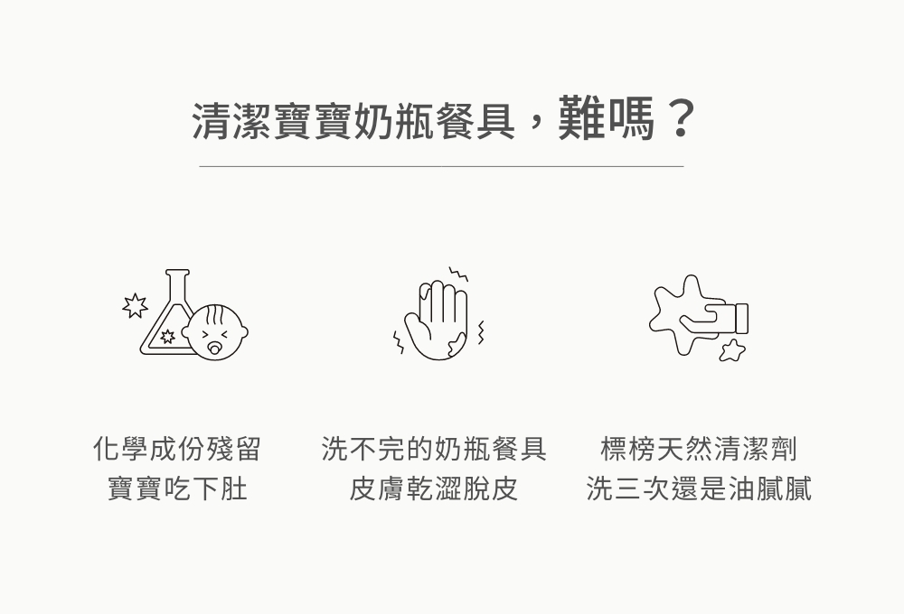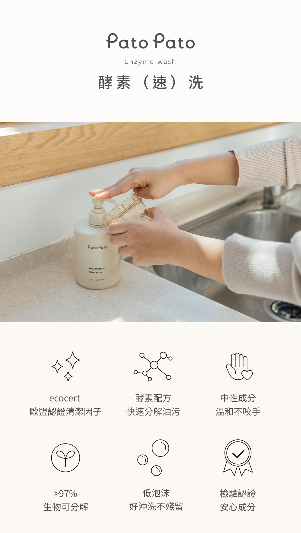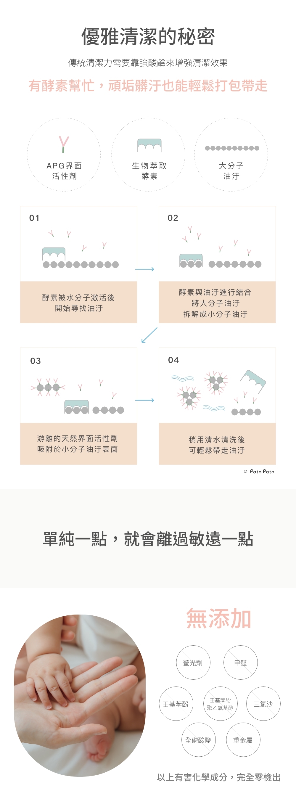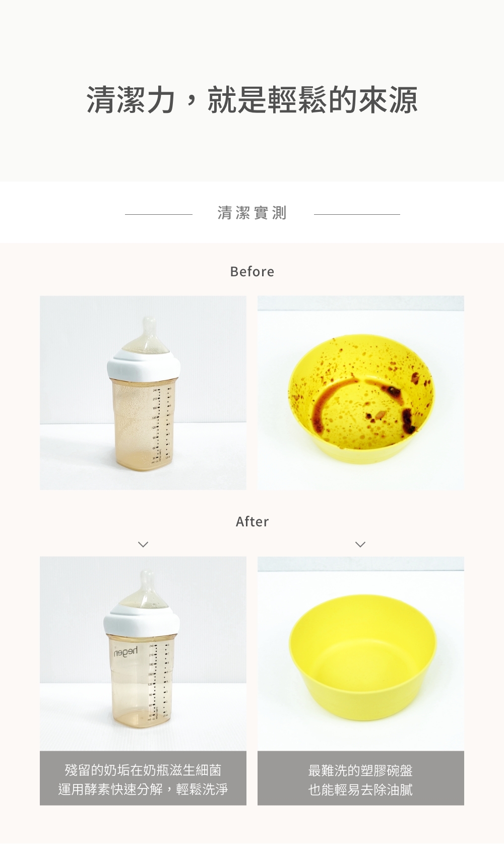1 ◦ 酵素配方,輕易分解奶瓶餐具表面的油垢、髒污,清洗奶瓶餐具變得好輕鬆。