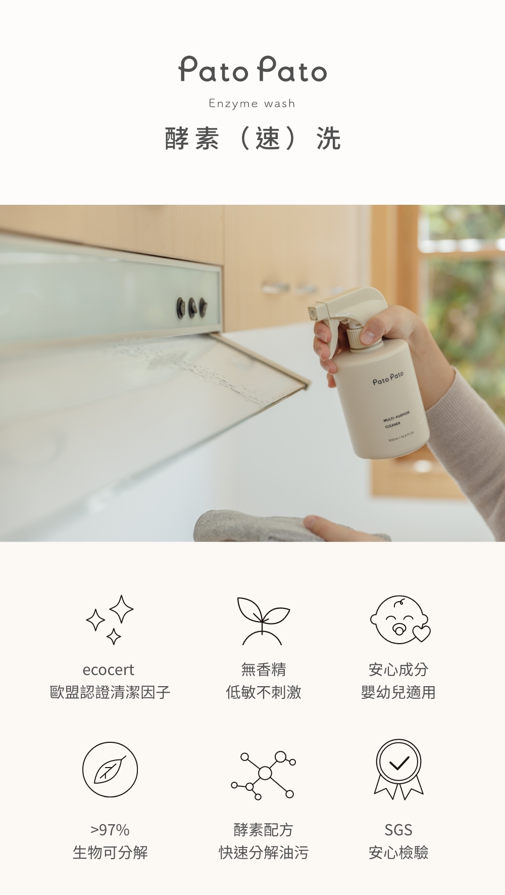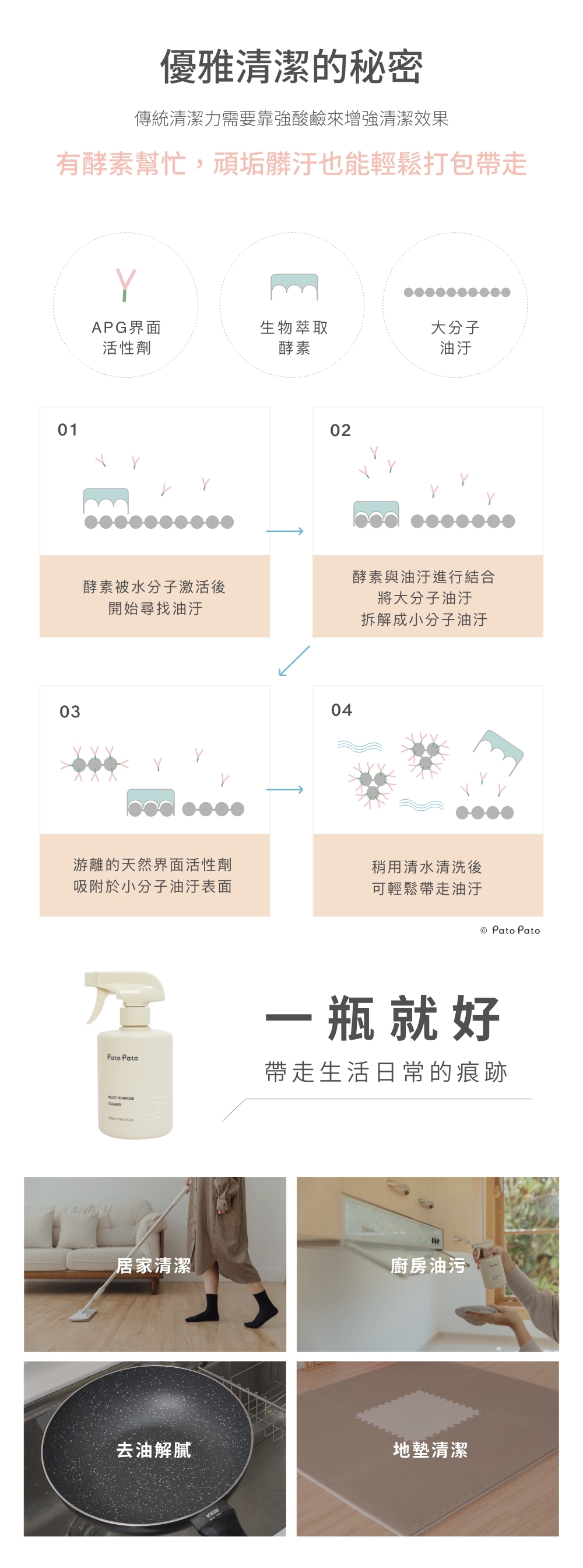 1 ◦ 運用酵素活性,輕鬆拆解髒污油垢,不用強酸鹼也能達到強力去污的效果。