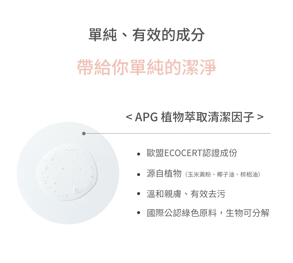 2 ◦ Ecocert認證APG界面活性劑,好沖洗不殘留,生物可分解更友善地球。
