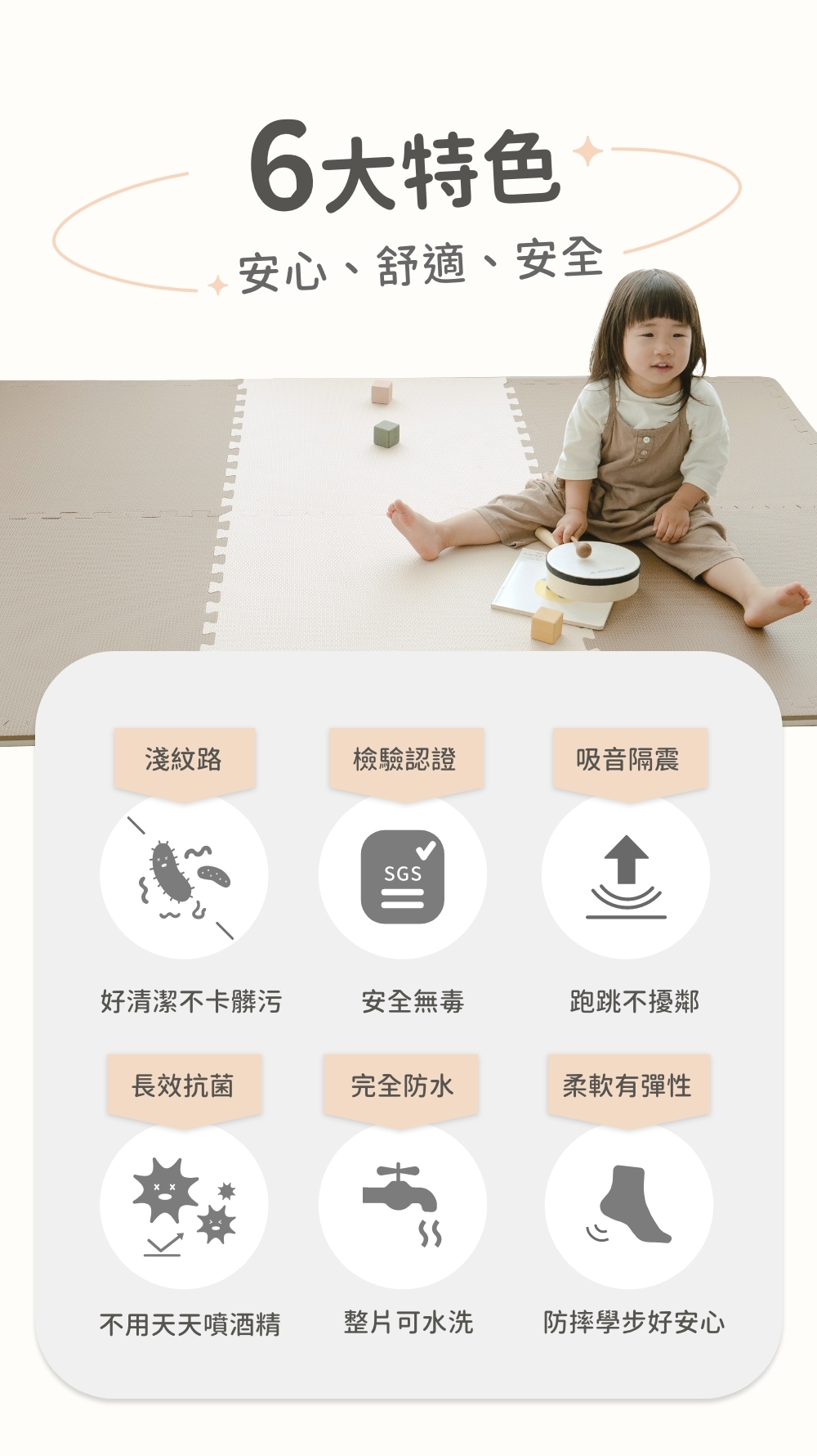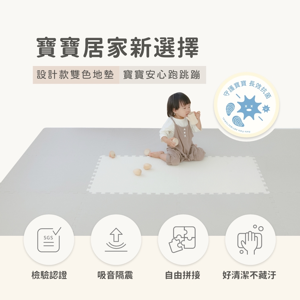 1.雙色系列巧拼地墊,淺紋路不卡髒污、改良式拼接齒,灰塵不滲透,超好清潔。