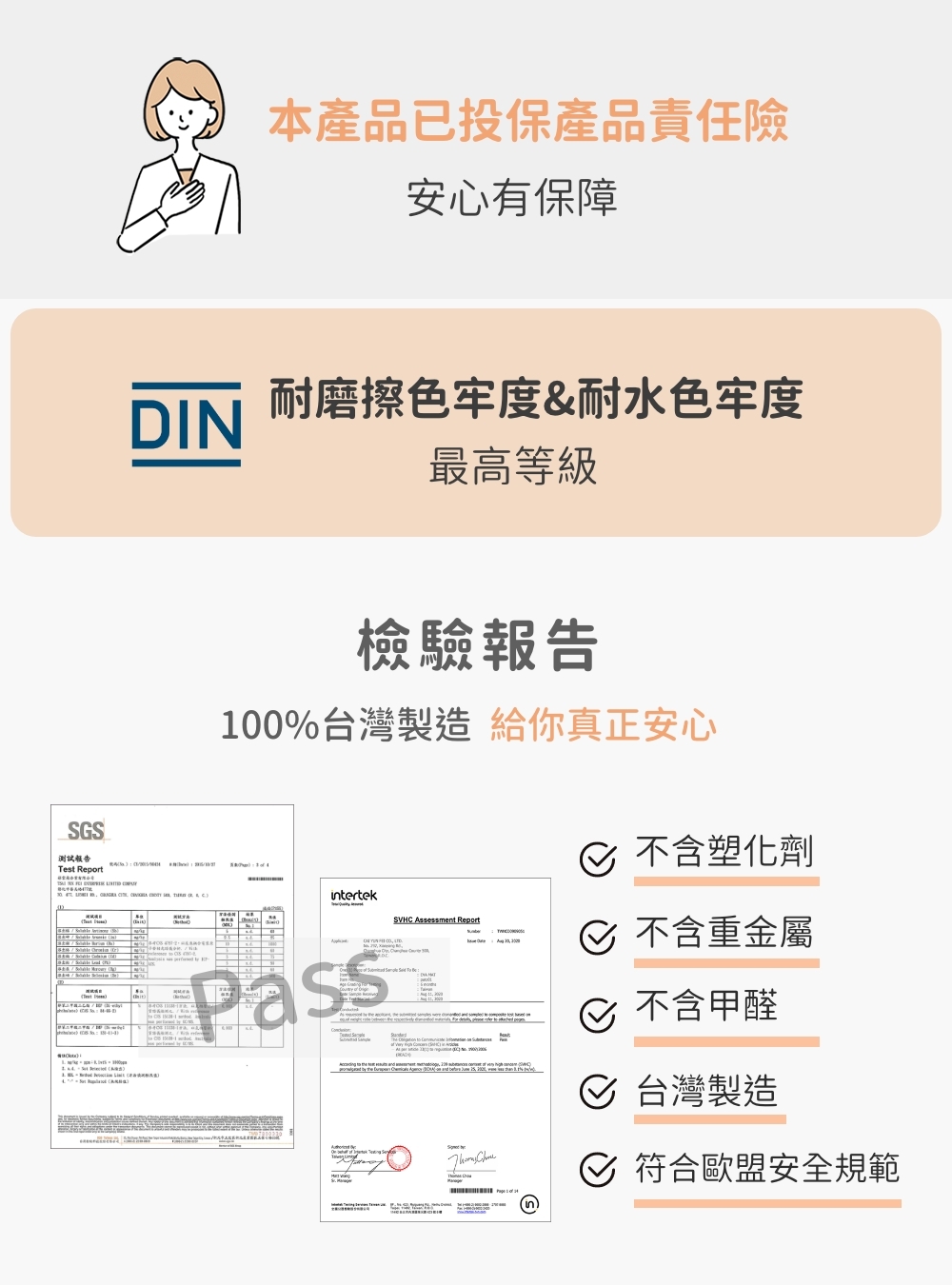 通過歐盟檢測標準,檢測內容共213項有毒物質,其中亦包含甲醯胺、塑化劑等項目全數通過。