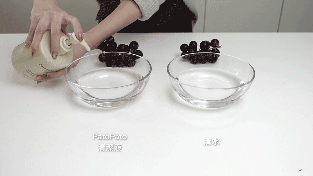 另外用葡萄來示範,可以看到葡萄在添加奶瓶餐具清潔液的清水浸泡清洗後,明顯和沒有添加清潔液的葡萄相比,更加明亮乾淨,輕鬆確保蔬果的乾淨健康度,讓寶寶大人都安心食用。