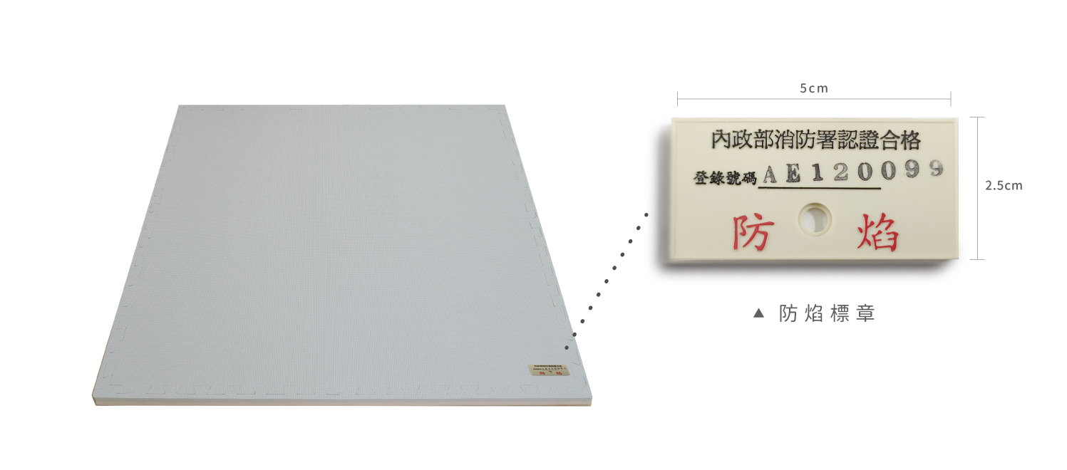 符合國家安全標準,通過SGS檢驗認證,安全無毒適合嬰幼兒、老人機構使用,包含幼稚園、托嬰中心地墊、親子館、健身房地墊、安養中心...等法規指定需要防焰規範物品之公共空間。