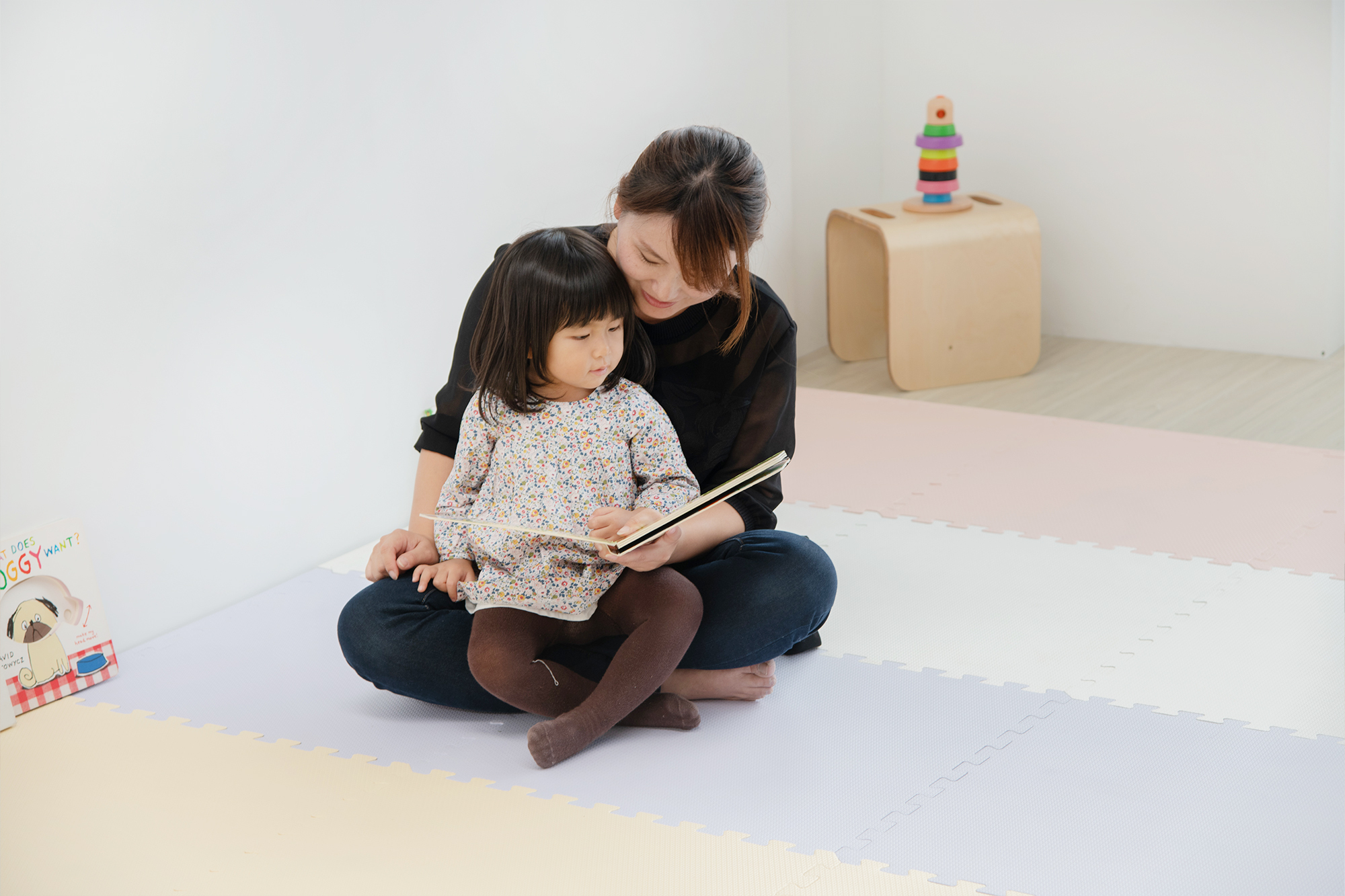 閱讀角的環境最好擁有充足光線、能夠舒適坐下,放置開放式的書櫃,方便孩子們拿取歸位書籍,建議鋪設地墊在閱讀角中,地墊擁有隨意鋪設的特性,方便爸媽更換空間大小、位置安排,也能與其他居家領域有效劃分出來。地墊擁有一定彈性又具緩衝力,讓寶寶擁有足夠支撐力坐著閱讀、隨著故事內容蹦蹦跳跳也沒關係。