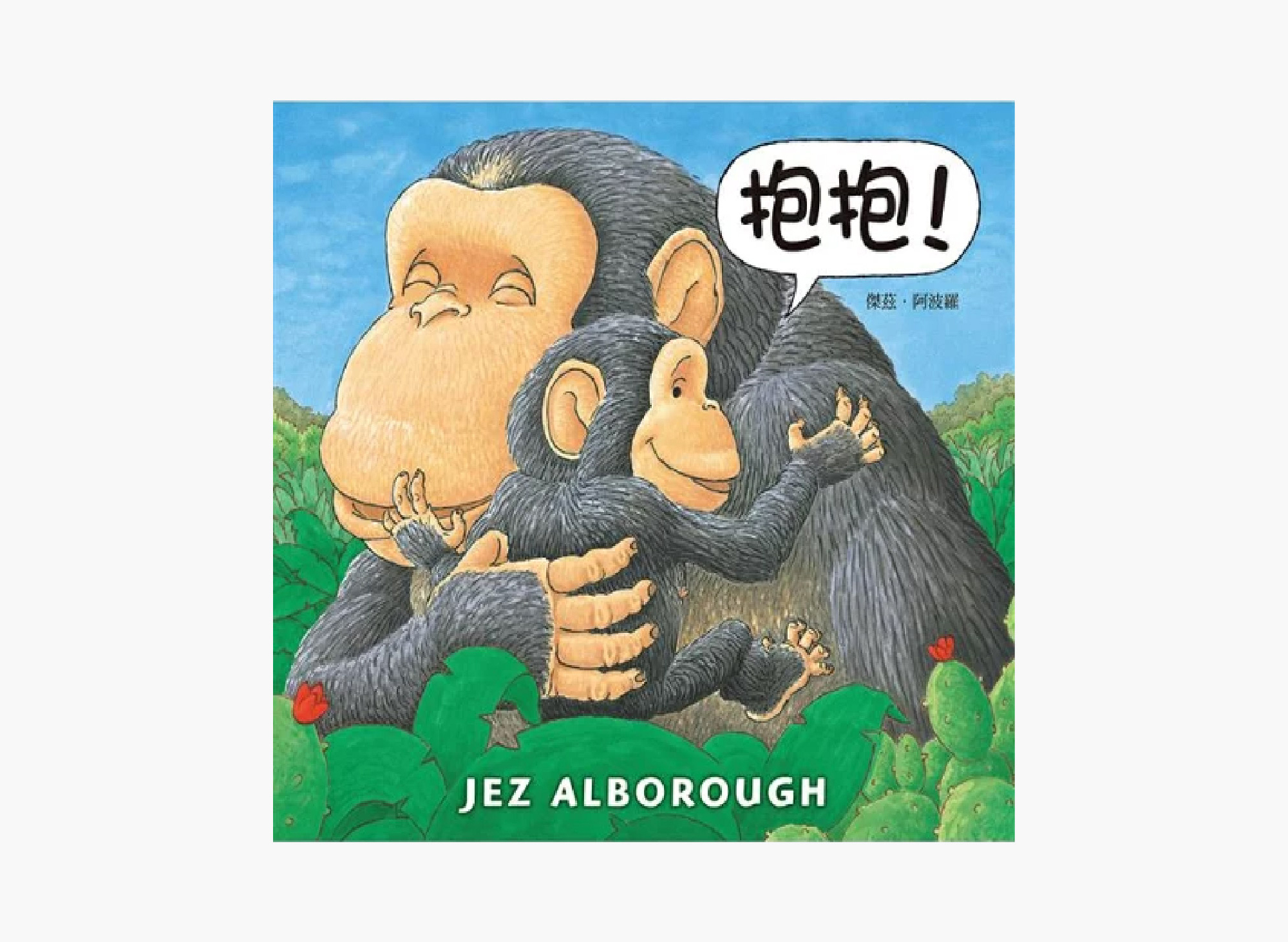 一隻叫「寶寶」的小猩猩尋遍森林,要媽媽抱抱。結果走著走著,一路上有象媽媽給小象抱抱、獅媽媽給小獅抱抱,長頸鹿媽媽也給小長頸鹿抱抱……小寶寶愈看愈著急,忍不住大哭了起來。就在這個時候,猩猩媽媽出現了,好好地給小猩猩一個甜蜜的擁抱。森林裡的動物不禁歡呼「抱抱!」。