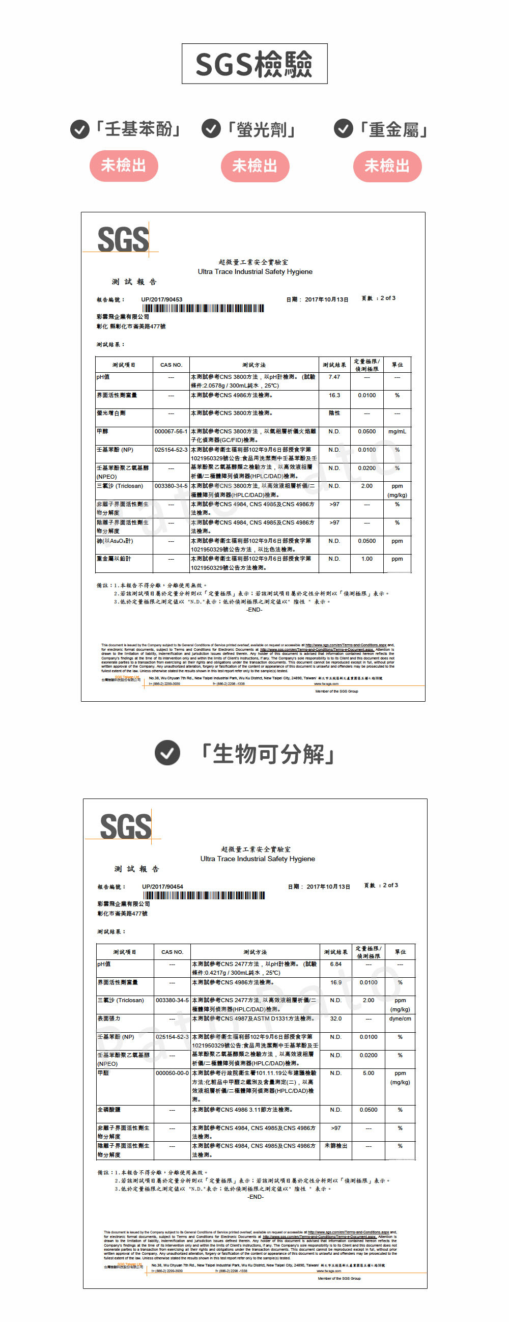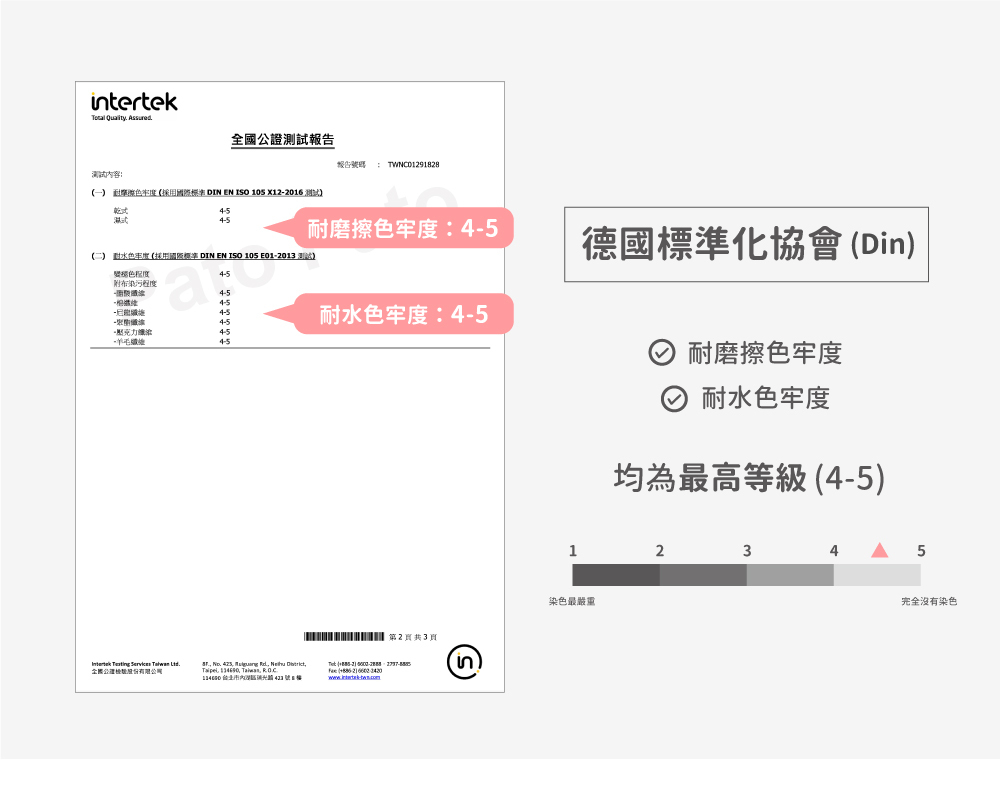 以標準白棉布的汙染情形,作為評級標準(共1-5級),Grade 1最差(被染色最嚴重),Grade 5最好(完全沒有被染色)。
