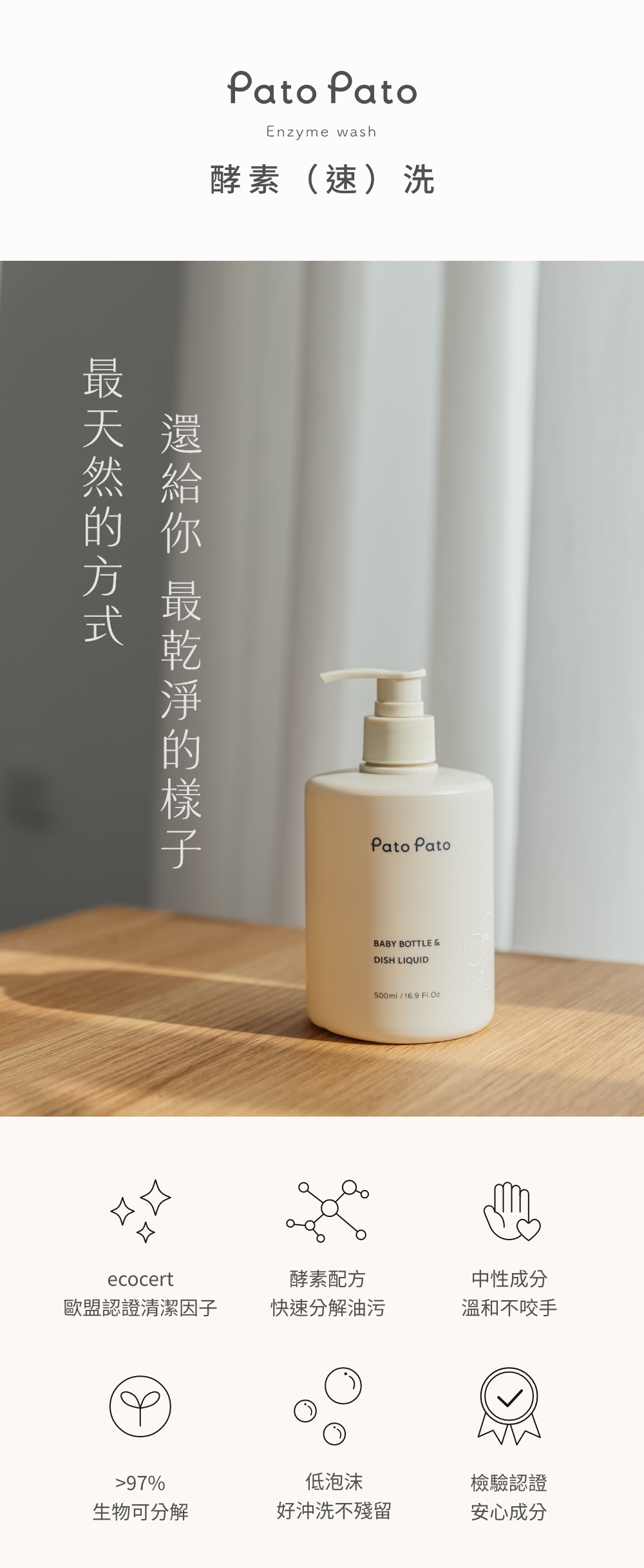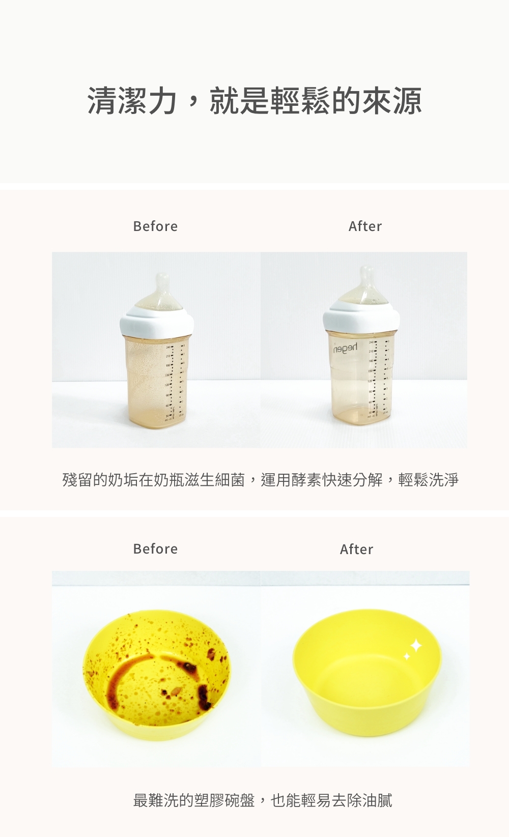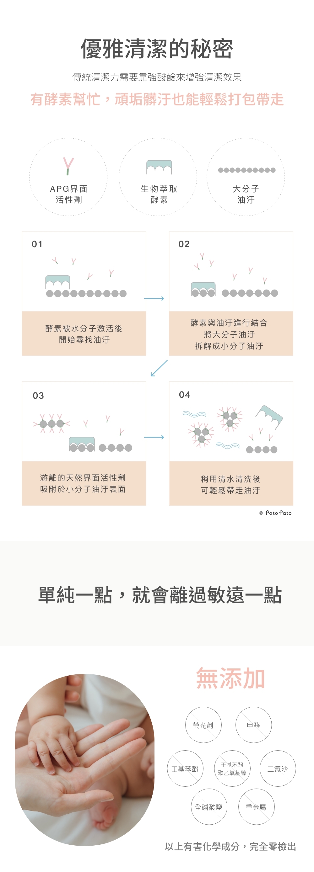 -酵素配方,搭配嚴選天然植物萃取界面活性劑,輕易分解奶瓶餐具表面的油垢、髒污,讓清洗奶瓶餐具變得好輕鬆。