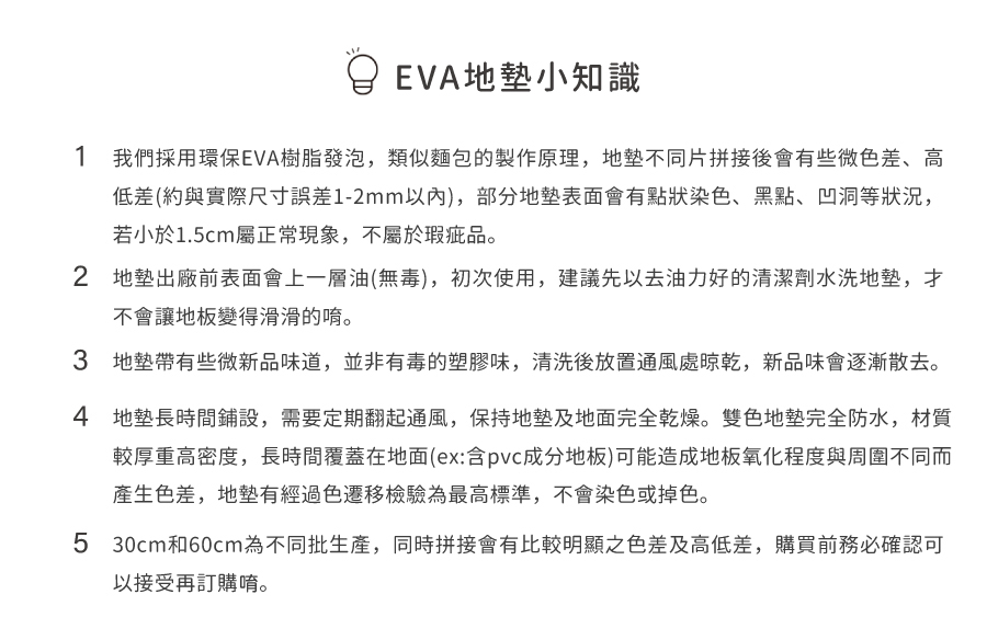 *地墊為發泡製程具±2mm之厚度差異,邊條屬於贈品若有黑點、染色及斷開不屬於產品瑕疵唷*