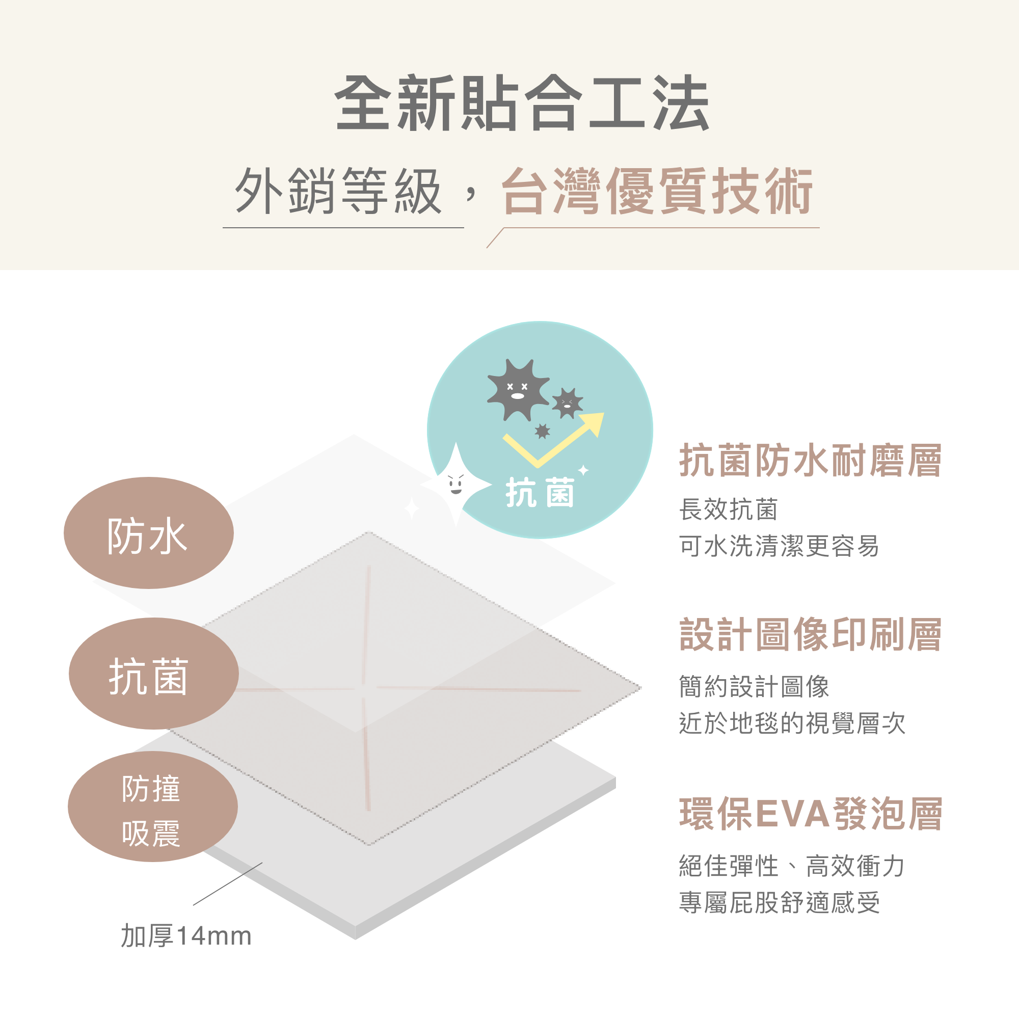- 特殊配方防水、耐磨抗菌層,清潔更輕鬆