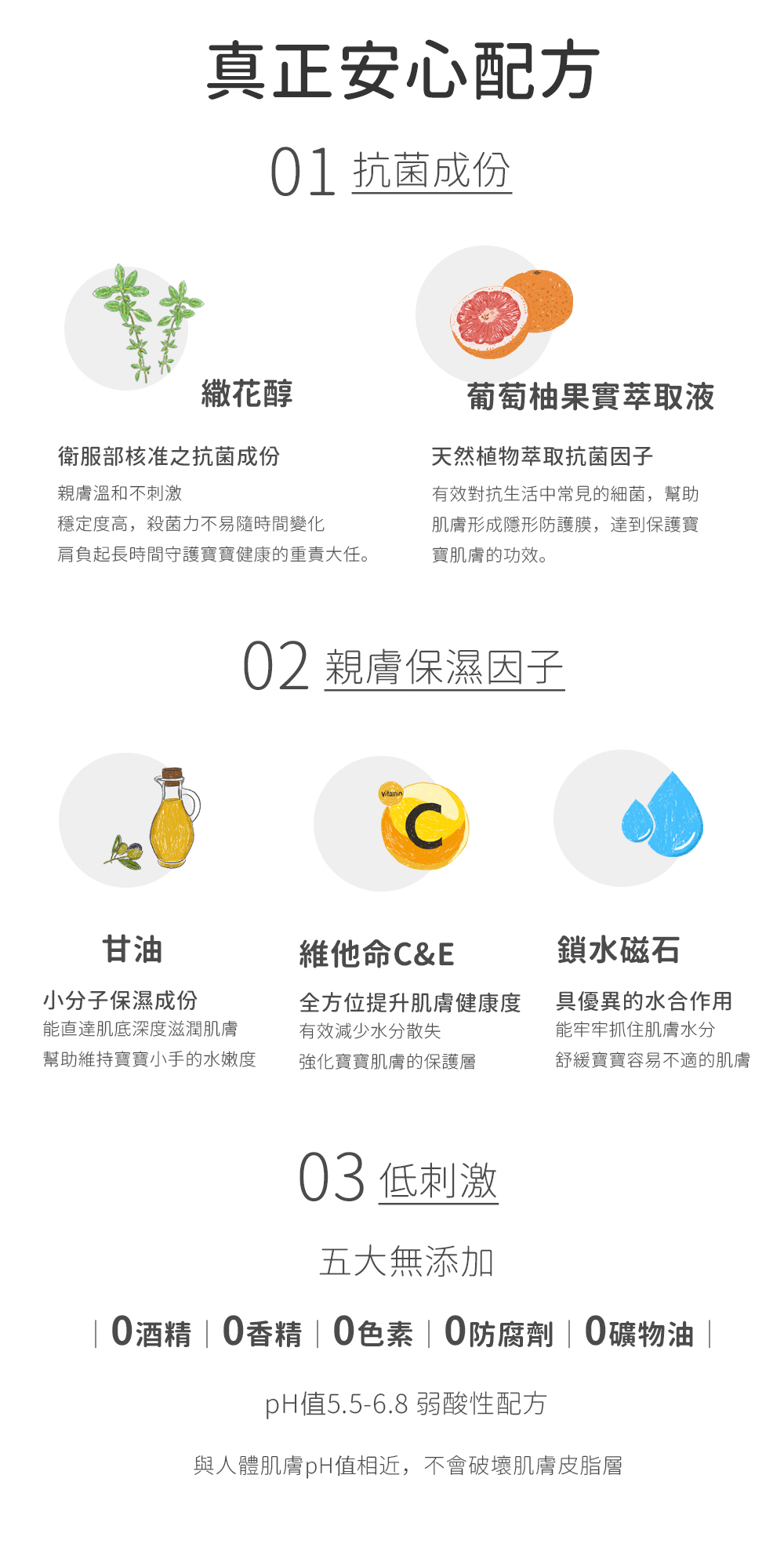 -不含酒精,安全溫和不刺激,寶寶、敏弱肌膚適用。